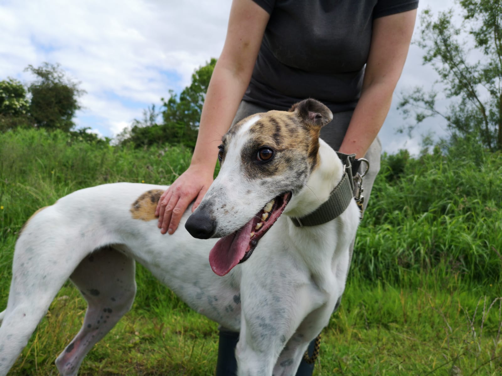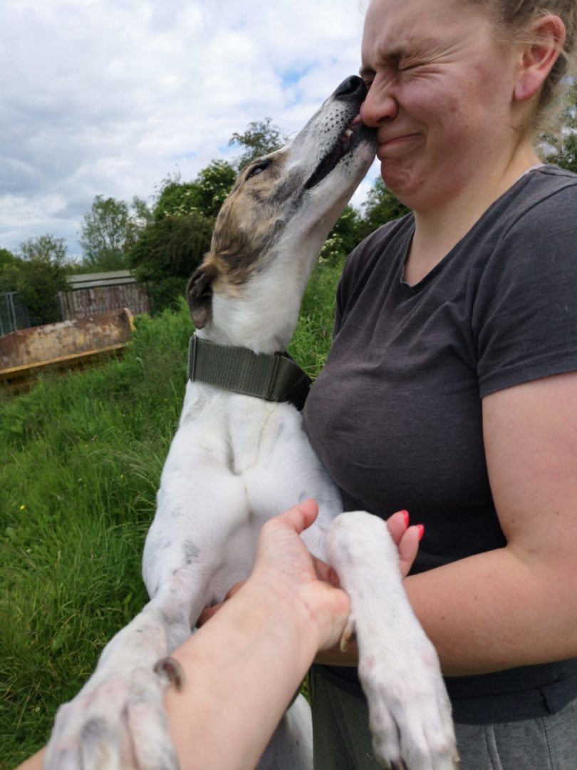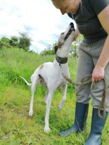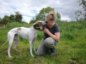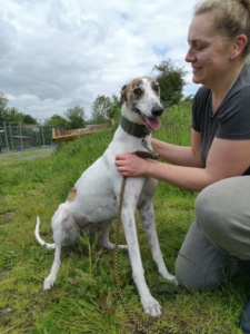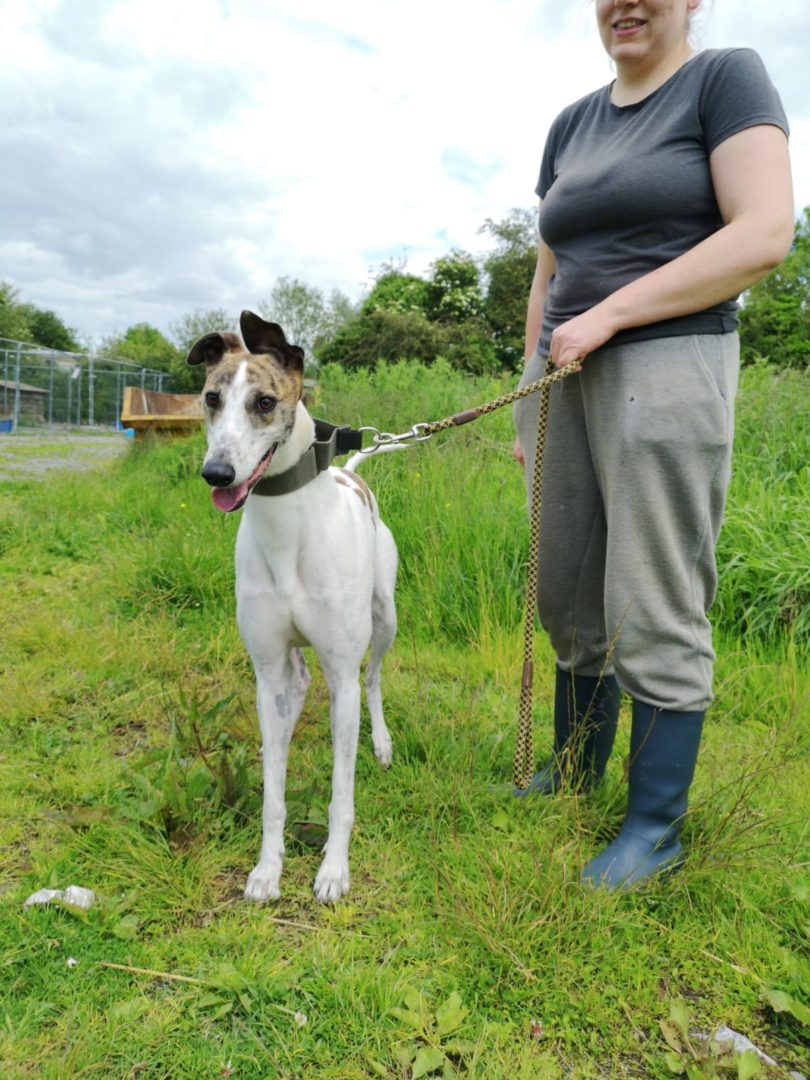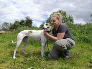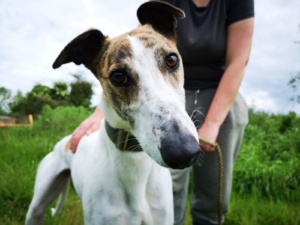 Dolly kam in die Obhut der irischen Tierschützer mit einer Verletzung der Hüfte, mittlerweile ist alles wieder in Ordnung und sie hat keinerlei Einschränkungen. Sie ist ein sehr freundlicher und unhänglicher Grey. Sie verbrachte viel Zeit mit kleinen Hunden, manchmal ist sie vielleicht zu übermütig. Dolly geht sehr gut an der Leine und kommt gut mit Rüden und Hündinnen aus. Um Katzen sollte man einen Bogen machen.